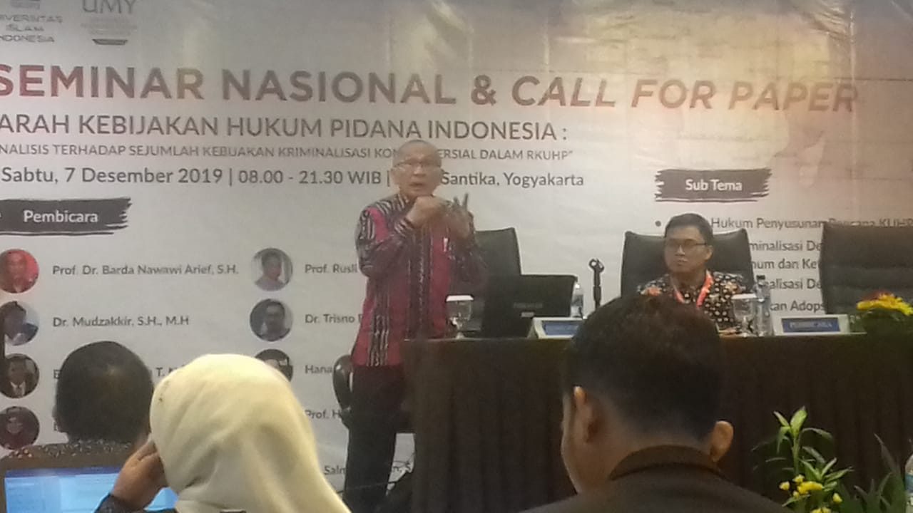 Karena itu, sangat mengherankan dengan sikap sebagian mahasiswa maupun sejumlah pihak yang menolak Rancangan KUHP untuk ditetapkan menjadi KUHP yang baru menggantikan KUHP lama. “Penolakan terhadap RKUHP tidak sesuai dengan karakter mahasiswa yang reformis atau pendukung reformasi. Dimana jiwa dan semangat reformasinya kalau mereka menolak RKUHP sebagai bentuk perubahan atau reformasi atau pembaharuan hukum warisan kolonial Belanda,” kata Prof Dr Barda Nawawi Arief SH, Guru Besar Hukum Pidana Universitas Diponegoro (Undip), saat menjadi keynote speaker pada seminar nasional ‘Arah Kebijakan Hukum Pidana Indonesia : Analisisi terhadap Sejumlah Kebijakan Kriminalisasi Kontroversial dalam RKUHP’ di Hotel Santika Yogyakarta, Sabtu (7/12/2019). Seminar yang diselenggarakan Fakultas Hukum UII dan Fakultas Hukum Universitas Muhammadiyah Yogyakarta (FH UMY) ini menampilkan sejumlah narasumber yang ahli dalam bidang hukum pidana.