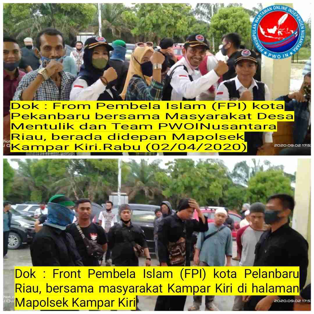 “Kami Front Pembela Islam (FPI) kota Pekanbaru Provinsi Riau, hadir di sini di desa Mentulik Kampar Kiri Kabupaten Kampar atas permohonan permintaan masyarakat dan tokoh masyarakat yang menjumpai kami di Pekanbaru, meminta kepedulian Front Pembela Islam dapat membela masyarakat miskin yang diduga di zholimi dengan dugaan penyerobotan lahan perkebunan sawit milik masyarakat secara paksa oleh oknum ES menggunakan tangan JS Cs dengan mendirikan Basecame di lahan masyarakat. Agar masyarakat tidak dapat melaksanakan aktifitas memanen Sawit yang telah dikelola bertahun-tahun oleh masyarakat setempat, yakni lahan perkebunan sawit yang terletak di Desa Mentulik, ” ungkap Husni Thamrin Ketua FPI kota Pekanbaru, saat di jumpai awak media dan team PWOI Nusantara Riau di halaman Mapolsek Kampar Kiri Kabupaten Kampar. Rabu (02/04/2020)