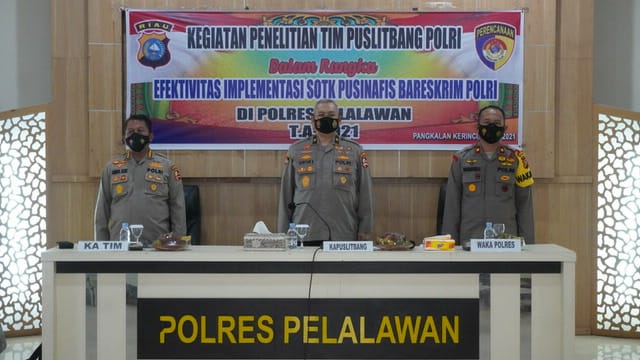 Pelalawan, fokuskriminal.com.-Tim Pusat Penelitian dan Pengembangan (Puslitbang) Polri laksanakan Penelitian dan Supervisi Tentang Efektifitas Implementasi Sistem Organisasi Tata Kerja (SOTK) Pusinafis Bareskrim Polri, Rabu (09/06/2021) di Gedung Aula Teluk Meranti Polres Pelalawan.