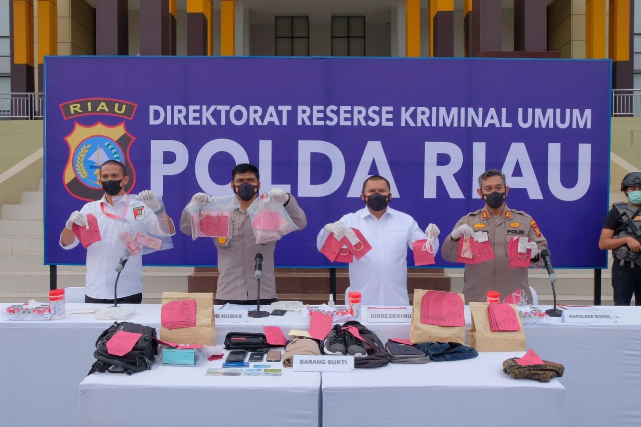 “Ke 4 pelaku ini beraksi dengan cara mengancam menggunakan pisau sangkur terhadap korban Daniel Sapta, selaku Teknisi mesin ATM,” ujar Kabid Humas Polda Riau, Kombes Sunarto saat konferensi pers didampingi Dirkrimum Kombes Teddy Ristiawan dan Kapolres Rohul, AKBP Eko Wimpiyanto, Senin (13/9/2021) sore.