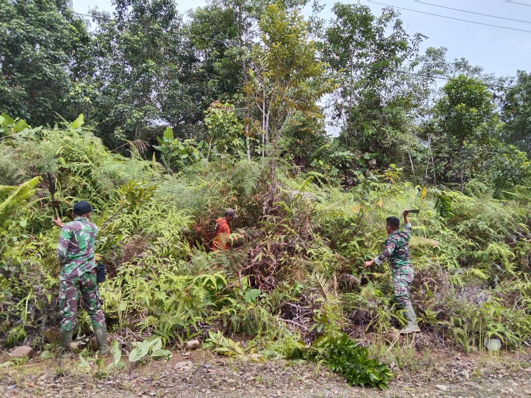 Jaung, fokuskriminal.com.-Anggota Satgas Pamtas RI-Malaysia Yonif 144/JY melaksanakan gotong royong membersihkan jalan desa bersama warga di desa Jaung kecamatan Puring Kencana Kabupaten Kapuas Hulu Kalbar.
