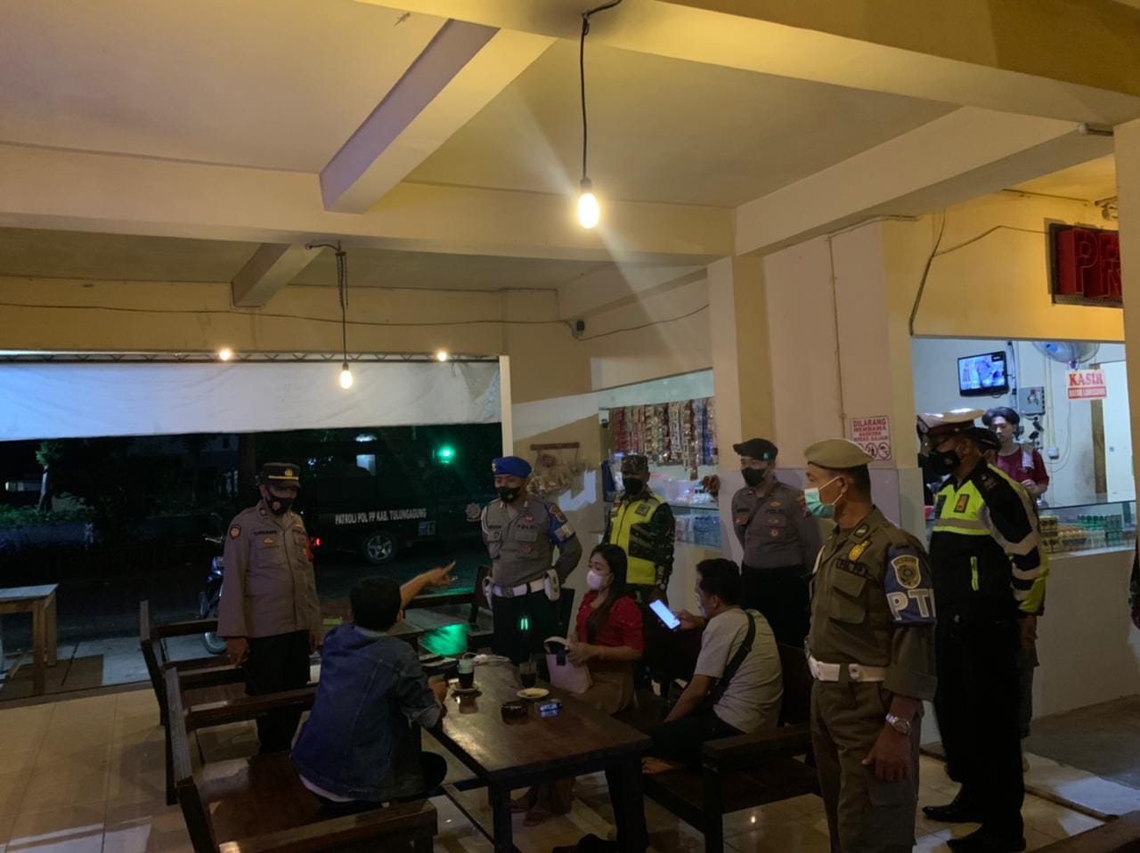 Saat menggelar patroli kemudian menjumpai café, rumah makan dan angkringan, petugas gabungan menghimbau pedagang maupun pengunjung untuk mentaati aturan sesuai yang ditetapkan.
