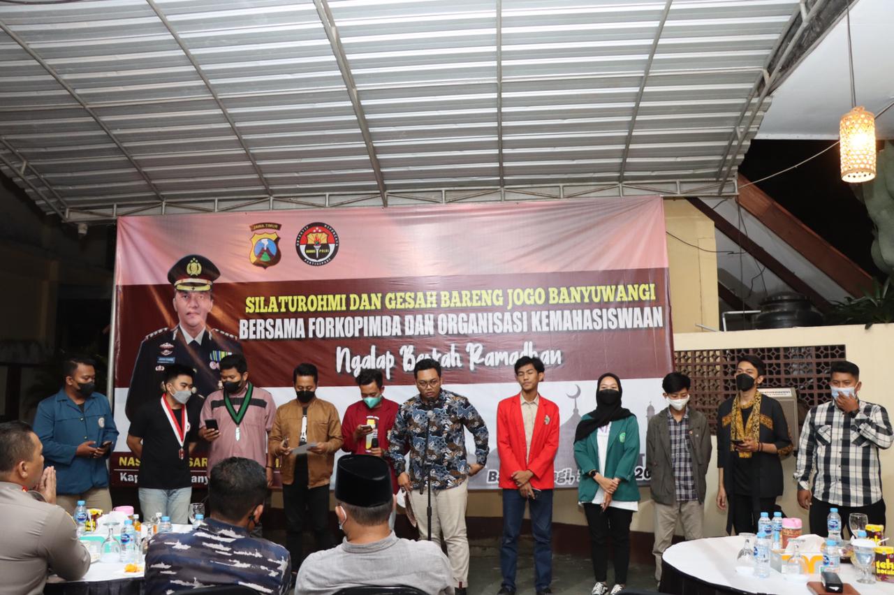 Kapolresta Banyuwangi dalam sambutannya menyampaikan bahwa kegiatan ini dilaksanakan dalam rangka silaturohim dan membangun sinergitas antara Forpimda Banyuwangi dengan elemen mahasiswa di Kabupaten Banyuwangi untuk bersama menjaga Kabupaten Banyuwangi.