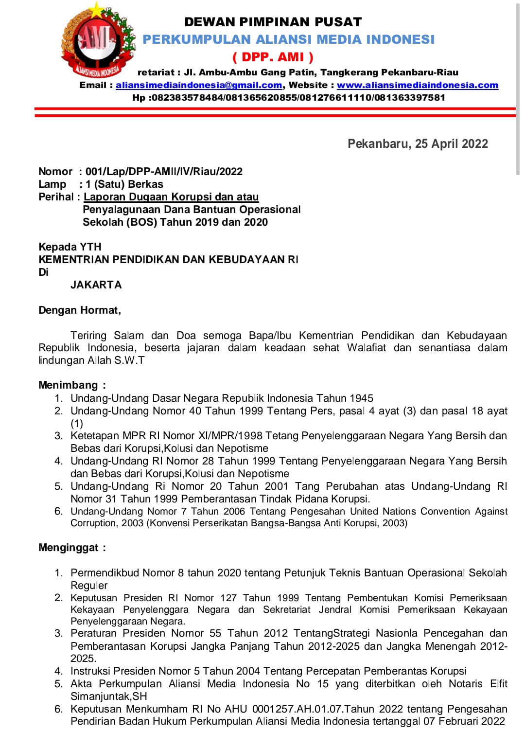 Dewan Pimpinan Pusat Perkumpulan Aliansi Media Indonesia (DPP-AMI) Provinsi Riau, resmi melaporkan Kepala Dinas Pendidikan kota Pekanbaru Ismardi Ilyas dan beberapa Kepala Sekolah jenjang Pendidikan ke Kementrian Pendidikan dan Kebudayaan secara tertulis dengan nomor surat : 001/Lap/DPP-AMI//IV/2022. Senin (25/04/2022)