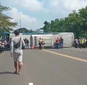 Madiun,fokuskriminal.com – Bus antar kota antar propinsi (AKAP) PO Sugeng Rahayu mengalami kecelakaan di Jalan Raya Madiun Nganjuk masuk Desa Jerukgulung, Balerejo, Madiun, Jawa Timur, Selasa (31/5/2022) pukul 10.20 WIB. Bus tersebut melintang dan menutup 100 persen arus lalu lintas.
