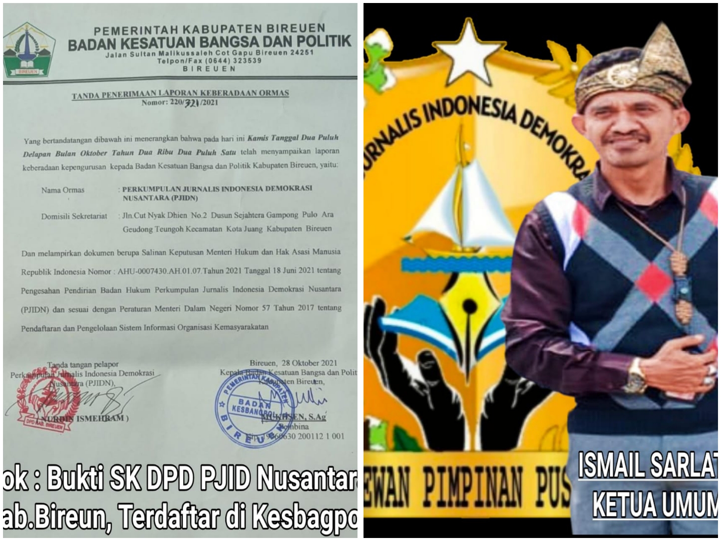 Sepertihalnya DPD PJID Nusantara Kabupaten Bireun, yang telah mendaftarkan dan atau meregisterkan ke Kesbangpol tertanggal 28 Oktober 2021 lalu, maka tetap berjalan SK yang telah diberikan sebelumnya, dan teruntuk Pengurus DPW Provinsi Aceh yang baru yang nantinya apabila sudah di SK-kan oleh DPP, diminta untuk dapat memberikan surat pemberitahuan kepada seluruh DPD PJID Nusantara, Pemerintah dan Masyarakat kota/Kabupaten se Provinsi Aceh nantinya.