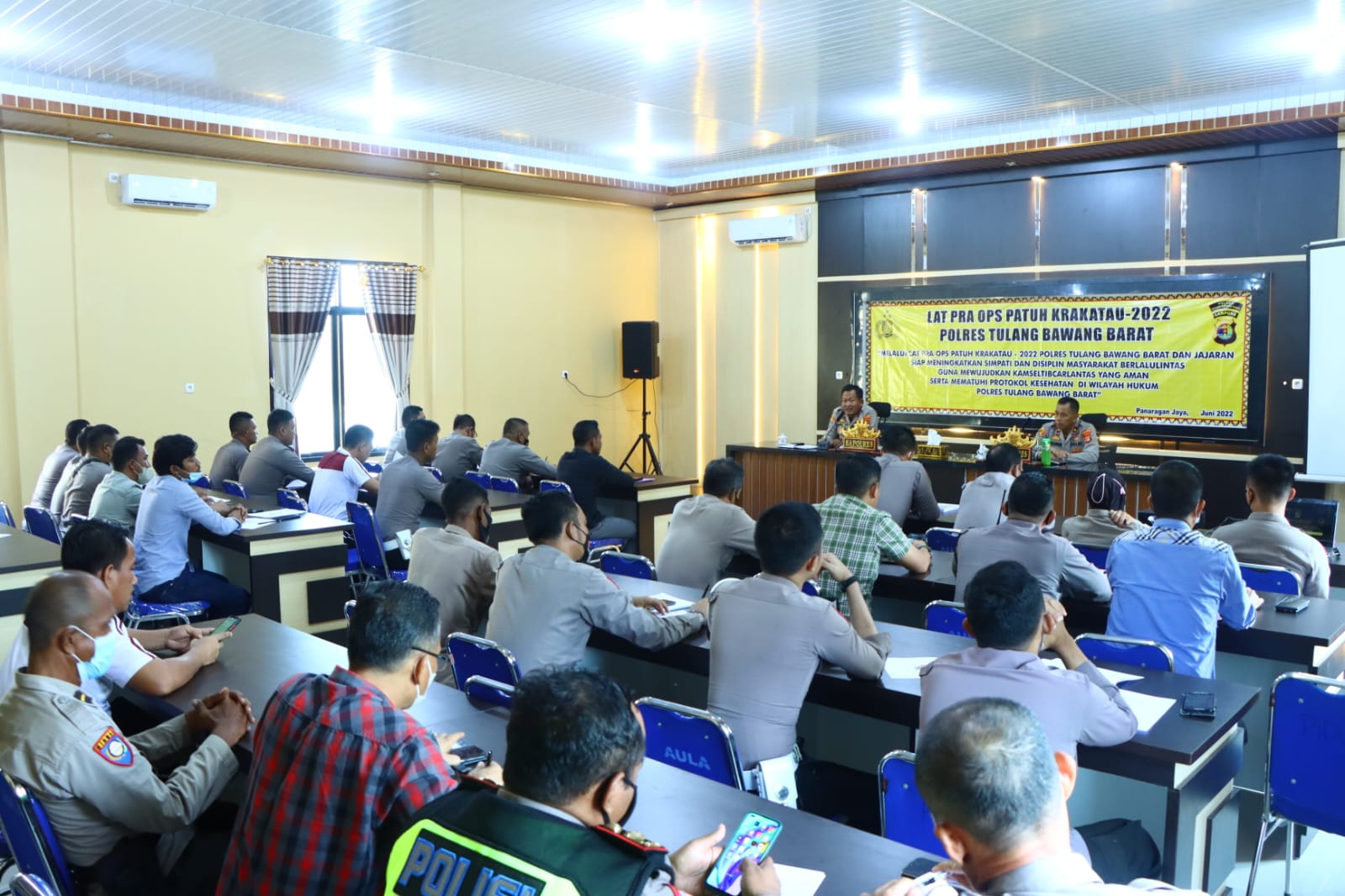 Kegiatan Latihan Pra Operasi (LATPRAOPS) terpusat Patuh Karakatau 2022 Polres Tulang Bawang Barat dipimpin langsung Kapolres Tubaba diikuti PJU dan Kapolsek jajaran serta seluruh anggota yang terlibat operasi.