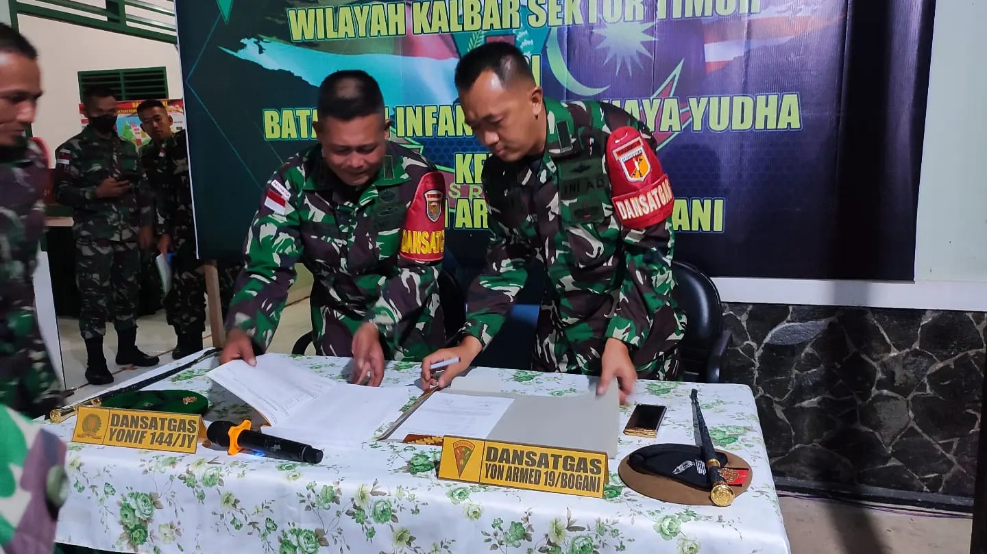 Pelaksanaan serah terima dipimipin oleh Dansatgas Yonif 144/JY Letkol Inf Andri Suratman dan Dansatgas Yonarmed 19/105 Trk Bogaaani Letkol Arm Edi Yulian Budiargo, S.Sos., M.Han. dan diikuti oleh seluruh Perwira Staf.