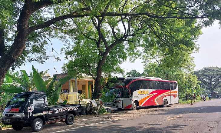 Bagian depan bus mengalami kerusakan, bahkan kaca depan pecah akibat benturan dengan batang pohon mindi.