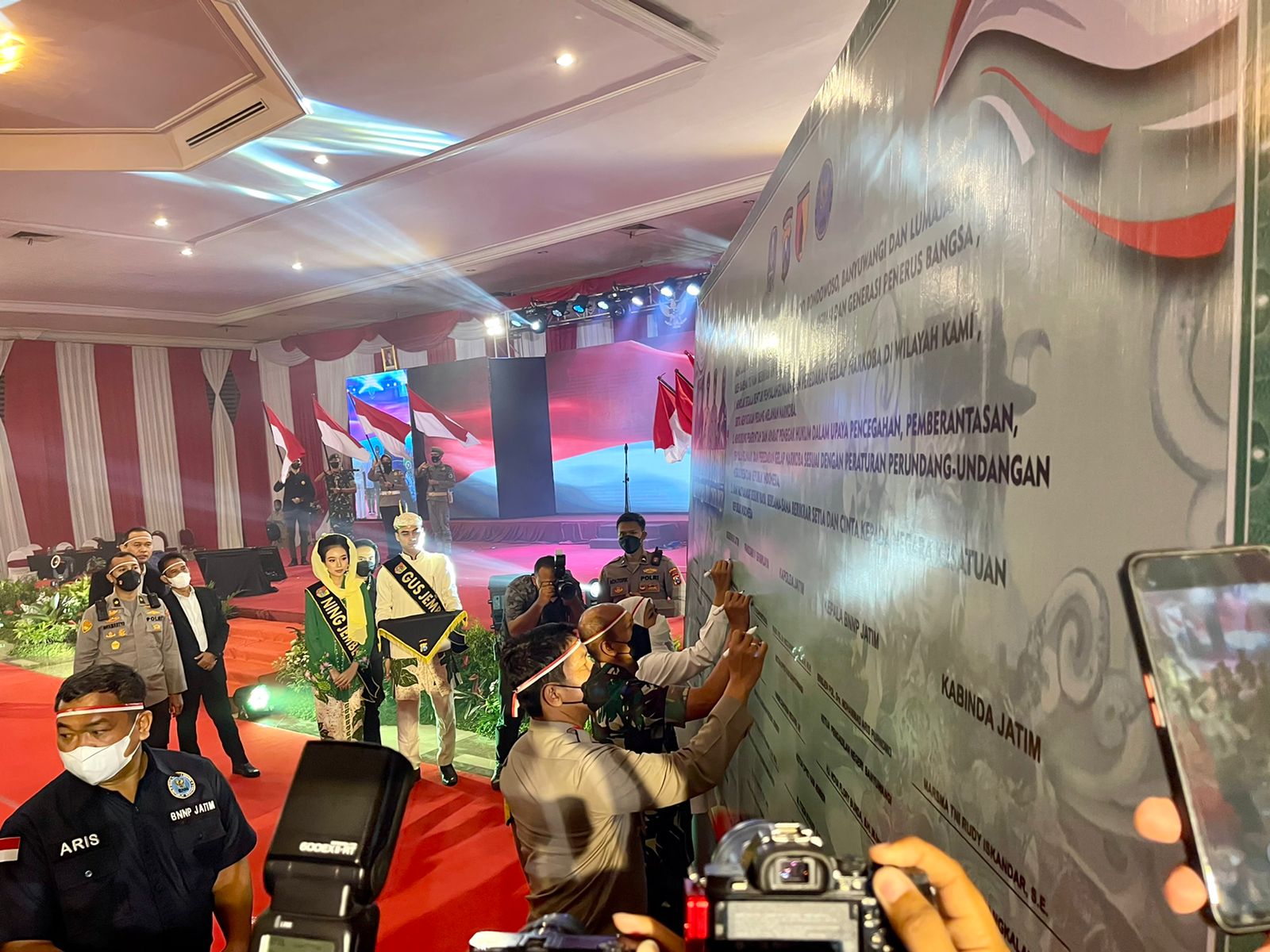 Usai mengikrarkan, Gubernur Khofifah bersama Pangdam V Brawijaya, Kapolda Jatim, Kabinda Jatim dan Ka BNNP Jatim menandatangani papan deklarasi secara bersama-sama.