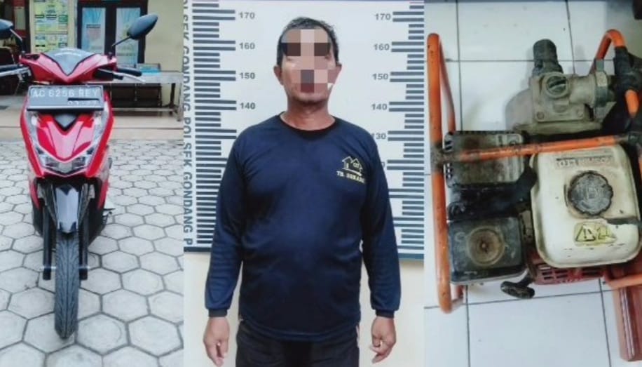 Petugas Polsek Gondang yang mendapatkan laporan kejadian langsung mendatangi lokasi kejadian guna mengamankan pelaku dan melakukan olah TKP serta penyelidikan. Dari kejadian ini petugas Unit Reskrim Polsek Gondang mengamankan barang bukti berupa 1 (satu) buah diesel pompa air merk Honda disita dari pelaku, 1 (satu) Unit sepeda motor merk Honda. Honda Beat warna Hitam Nopol AG 6256 REY.
