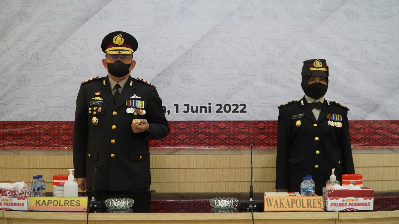 Pasuruan, fokuskriminal.com – Kapolres Pasuruan AKBP Erick Frendriz, S.I.K., M.Si. bersama Kabag SDM Polres Pasuruan AKP Mujiati dan para pejabat utama mengikuti kegiatan upacara peringatan hari lahir Pancasila tahun 2022 secara virtual di ruang Rupatama Polres Pasuruan, Rabu (01/06/2022).