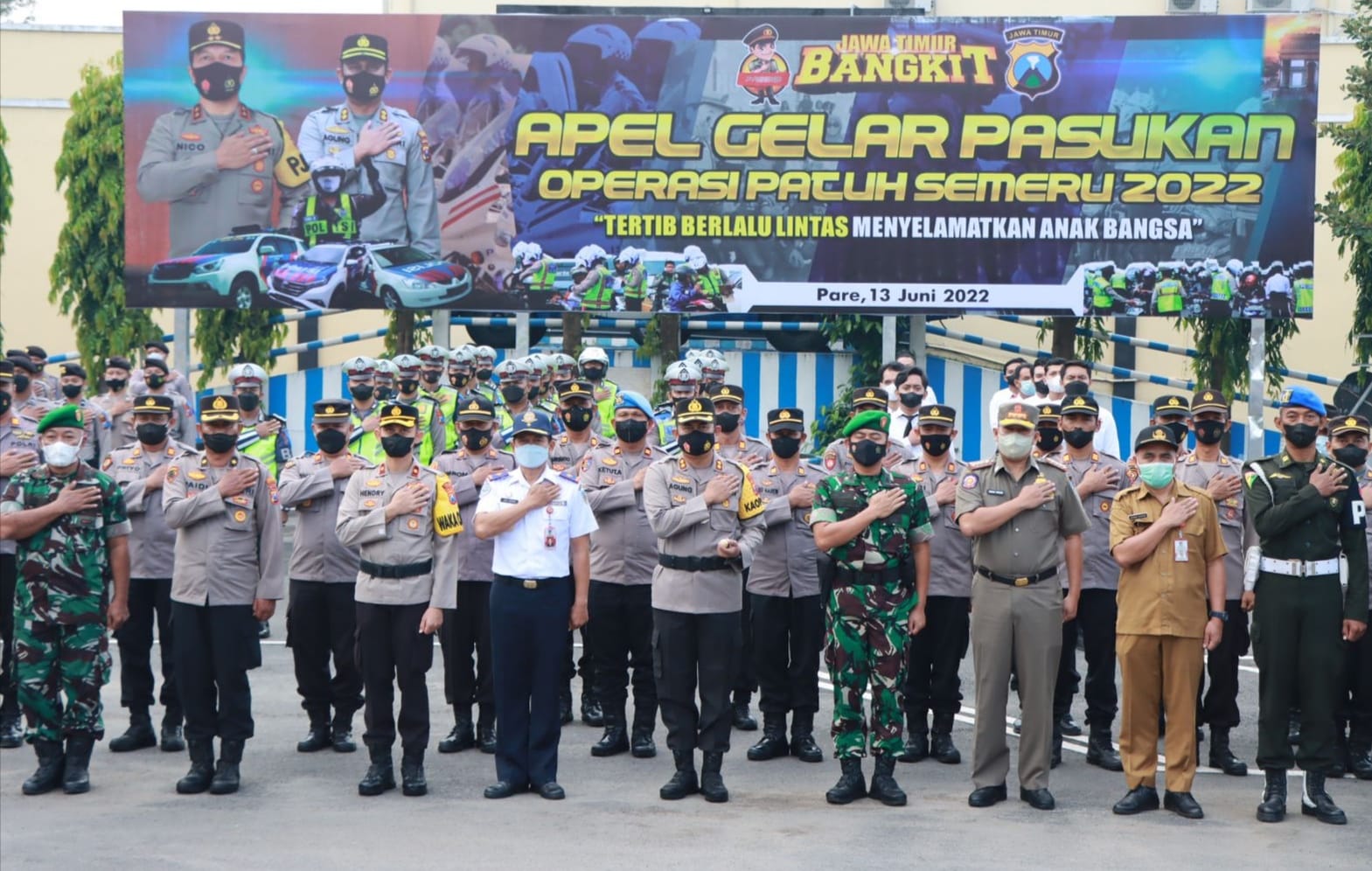 Hadir dalam apel gelar pasukan operasi Patuh Semeru 2022, dari TNI, Kejaksaan, Dishub, Satpol PP, Jasa Raharja Kediri, Kabag, Kasat, dan Kapolsek jajaran serta anggota Polres Kediri.