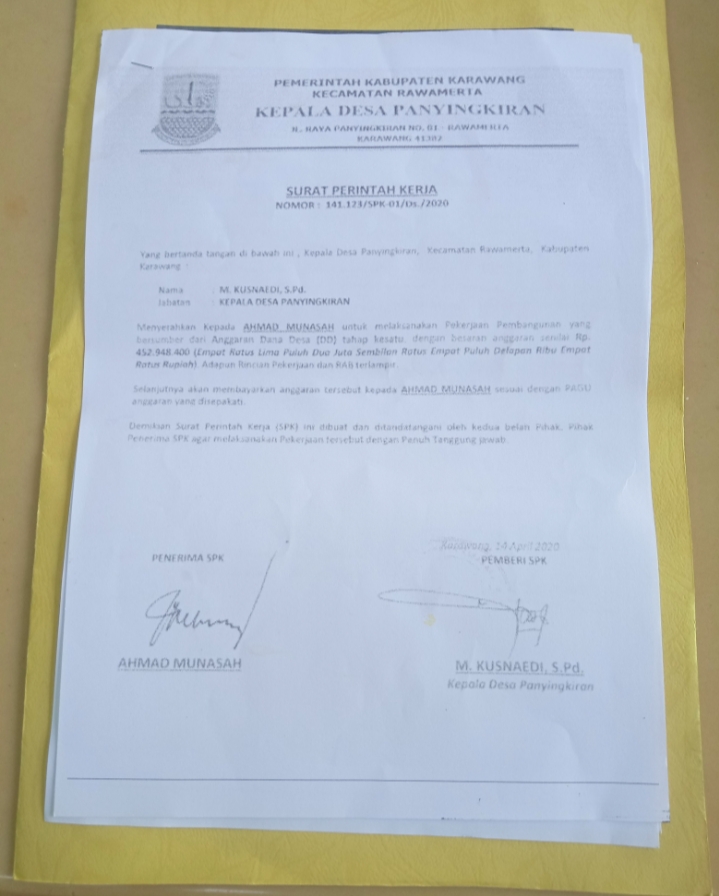 Bahkan lanjut Ahmad, dia pun mengeluarkan surat perintah kerja (SPK) yang dibuat oleh Kusnaedi selaku Kades yang ditandatangani dan distempel Pemerintah Desa Panyingkiran kepada dirinya.