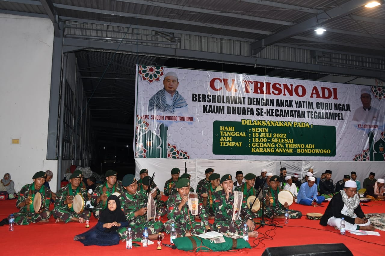 Bondowoso, fokuskriminal.com – Dandim 0822/Bondowoso Letkol Arm Suhendra Chipta, M.Tr.Hanla., menghadiri kegiatan berSholawat dengan Anak Yatim, Guru Ngaji, Kaum Dhuafa Se-Kecamatan Tegalampel Kabupaten Bondowoso, bertempat di Gudang CV. Trisno Adi Kel. Karanganyar Sekarputih Kec.Tegal Ampel Kab. Bondowoso.