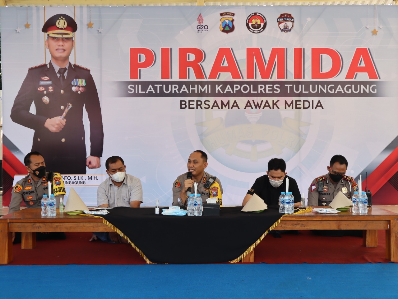 Kapolres Tulungagung, AKBP Eko Hartanto didampingi Wakapolres Tulungagung Kompol Dodik Tri hendro Siswoyo, bersama segenap pejabat utama (PJU), Kapolsek Tulungagung Kota Kompol Ernawan, dan puluhan jurnalis tampak bertatap muka untuk ramah tamah.