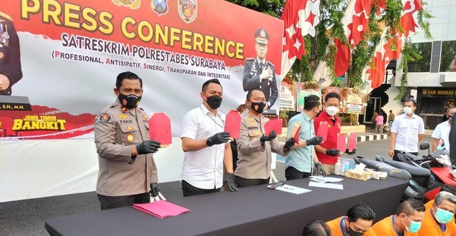 Wakapolrestabes Surabaya AKBP Hartoyo mengatakan modus operandi dilakukan komplotan itu mengaku sebagai petugas dari Kepolisian dan BNN.