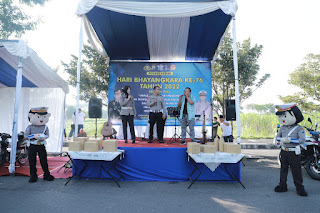Kediri, fokuskriminal.com – Memperingati Hari Ulang Tahun (HUT) Bhayangkara ke 76, Satlantas Polres Kediri menggelar kegiatan sosialisasi tertib lalu lintas di acara Car Free Day area wisata Simpang Lima Gumul Kecamatan Ngasem Kabupaten Kediri, Minggu pagi (3/7/2022).