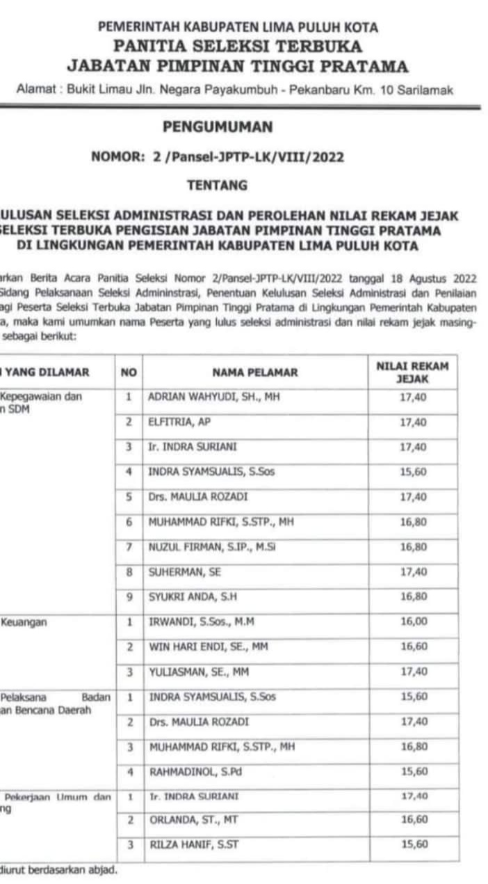 Dikutip dari Surat Pengumuman Pansel Terbuka untuk Jabatan Pimpinan Tinggi Pratama, Nomor: 2/Pansel-JPTP-LK/VIII/2022, Tentang : Kelulusan Seleksi Administrasi dan Perolehan Nilai Rekam Jejak, Seleksi terbuka pengisian Jabatan Pimpinan Tinggi Pratama di Lingkungan Pemerintahan Kabupaten Limapuluh Kota, bahwa :