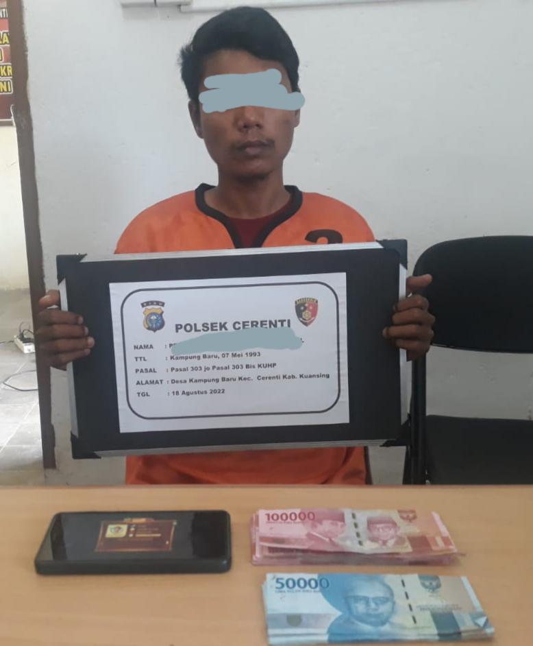 Kapolres Kuansing AKBP Rendra Oktha Dinata, SIK M.Si melalui keterangan resmi Kapolsek Cerenti IPTU Irwan Fikri, S.Sos, “ telah diamankan pelaku sebagai agen judi online jenis higgs domino menggunakan chip laki laki inisisl PJ di Counter Hand Phone Frengki Celuler miliknya yang berada di pinggir jalan Desa Kampung Baru Kecamatan Cerenti Kabupaten Kuantan singingi beserta barang bukti yang berhasil diamankan adalah 1 Unit Hp merk Xiaomi yg berisi aplikasi Higgs domino dan Uang sebesar 2.600.000 (Dua Juta Enam Ratus Ribu Rupiah),” ujar IPTU Irwan Sabtu ( 22/08/22) pagi