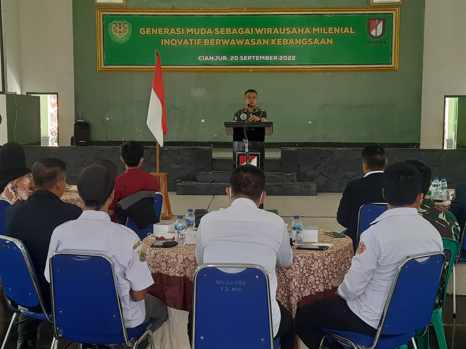 Kegiatan dengan tema “Generasi Muda Sebagai Wirausaha Milenial Inovatif Berwawasan Kebangsaan” tersebut dihadiri oleh Komandan Yonif Raider 300/Bjw (Mayor Inf Afri Swandi Ritonga), Pasi Intel Yonif Raider 300/Bjw (Letda Inf Tri Widodo), Ketua Karang Taruna Kab. Cianjur (Bpk. Mudrikah S.Ag) beserta jajarannya sebanyak 70 orang dengan mengundang Narasumber dari Dinas Koperasi, UMKM dan Industri Kabupaten Cianjur (Bpk. Bobby S.E dan Ibu Ria Gustinawati, SH) yang memberikan materi terkait pengembangan dan badan hukum dalam kewirausahaan
