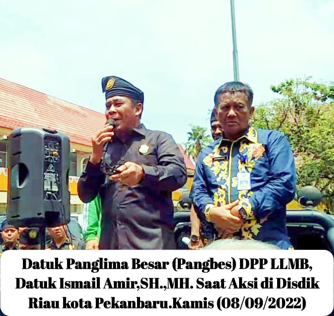PEKANBARU ,fokuskriminal.com.Ratusan anggota Laskar Melayu Bersatu (DPD LLMB) Pekanbaru menggelar aksi demo di halaman Kantor Dinas Pendidikan Provinsi Riau,Jalan Cut Nyak Dien Pekanbaru,Kamis (08/09/2022)
