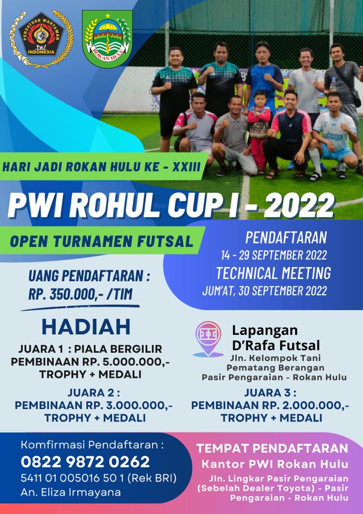 Open Turnamen Futsal PWI Rohul Cup I tahun 2022 yang merupakan rangkaian kegiatan PWI Rohul dalam menyambut Hari Ulang Tahun (HUT) Rokan Hulu ke-23 ini akan berlangsung selama 1 pekan, dimulai dari Selasa (4/10/2022) hingga Senin (11/10/2022) mendatang.