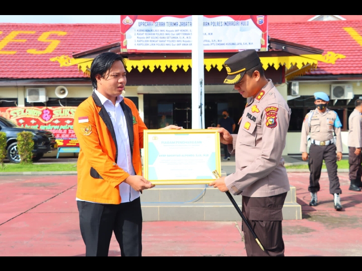 Penyerahan penghargaan dari perguruan tinggi bergengsi di Kabupaten Inhu tersebut dilakukan oleh Presiden BEM ITB Indragiri, Andika Karismon digelar dalam bentuk apel dan diterima oleh Kapolres Inhu, AKBP Bachtiar Alponso, S.I.K., M.Si di halaman Mapolres Inhu, Rabu 9 November 2022.
