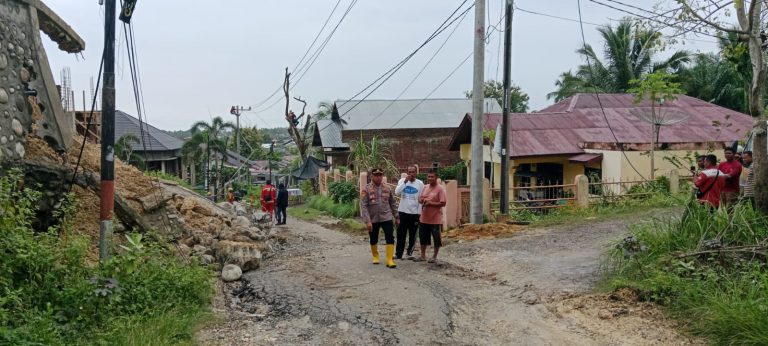 Kapolsek Muara Dua, Ipda Roni, SH meninjau lokasi tanah timbun tapak rumah yang Longsor di Gampong Panggoi, Kecamatan Muara Dua, Kota Lhokseumawe, Minggu (11/12/2022).