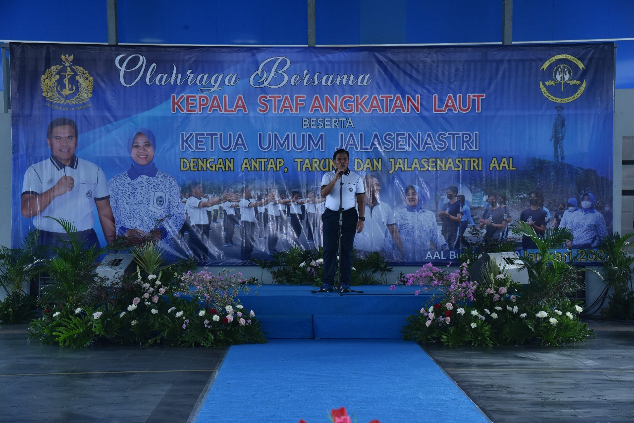 Surabaya , fokuskriminal.com. Kepala Staf Angkatan Laut Laksamana TNI Muhammad Ali didampingi Ketua Umum Jalasenastri Ny. Fera Muhammad Ali laksanakan olahraga bersama beserta seluruh prajurit Akademi Angkatan Laut (AAL), Pegawai Negeri Sipil (PNS) dan Taruna AAL yang digelar di Lapangan Banda, Kesatrian AAL, Bumimoro, Surabaya, Jumat (20/1).