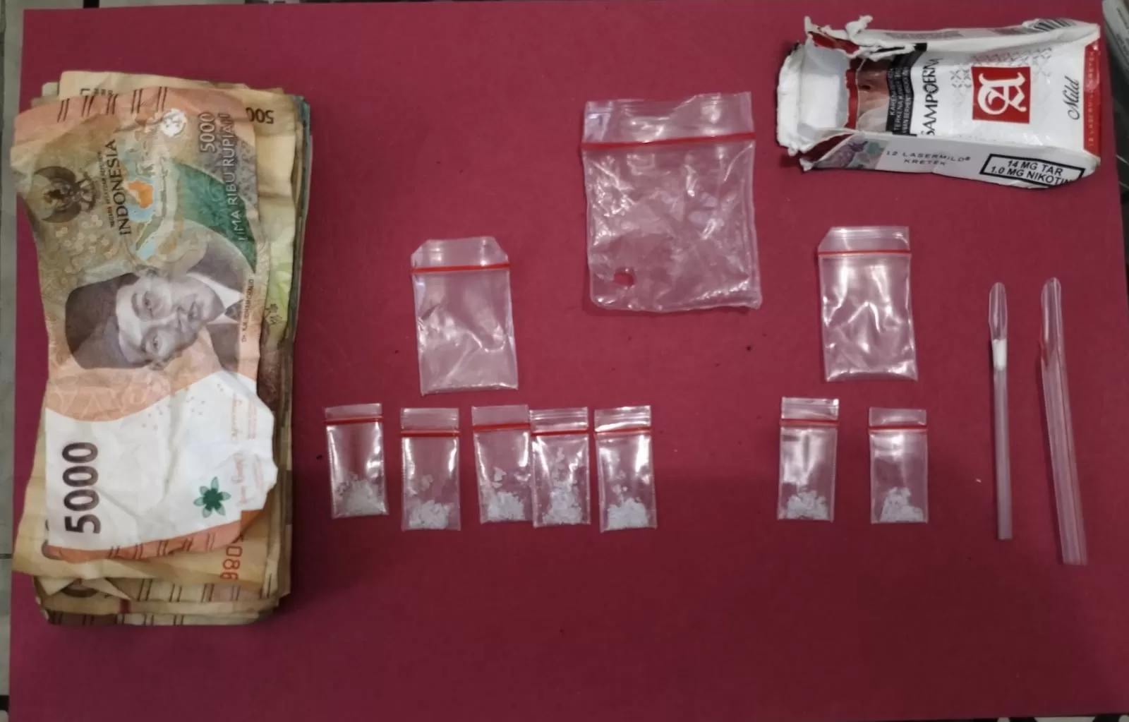 Dari M.R.S als ondok, petugas berhasil menyita 1(satu) buah plastik klip transparan berisi kristal putih yg diduga Narkotika jenis sabu, dibungkus dalam beberapa paketan seberat 0,48 gram netto,1 (bungkus) plastik klip berisi plastik klip kosong,uang tunai senilai Rp 505.000 hasil penjualan