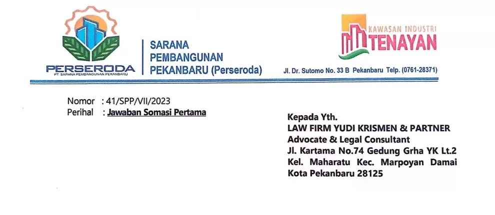 Fokuskriminal.comPekanbaru-Pada tanggal 01 agustus 2023 PT SPP telah memberikan jawaban atas Somasi Pertama dari Kantor Dr. YK terkait gaji karyawan PT TMP yang di bawah management PT SPP yang merupakan bagian BUMD Kota Pekanbaru.