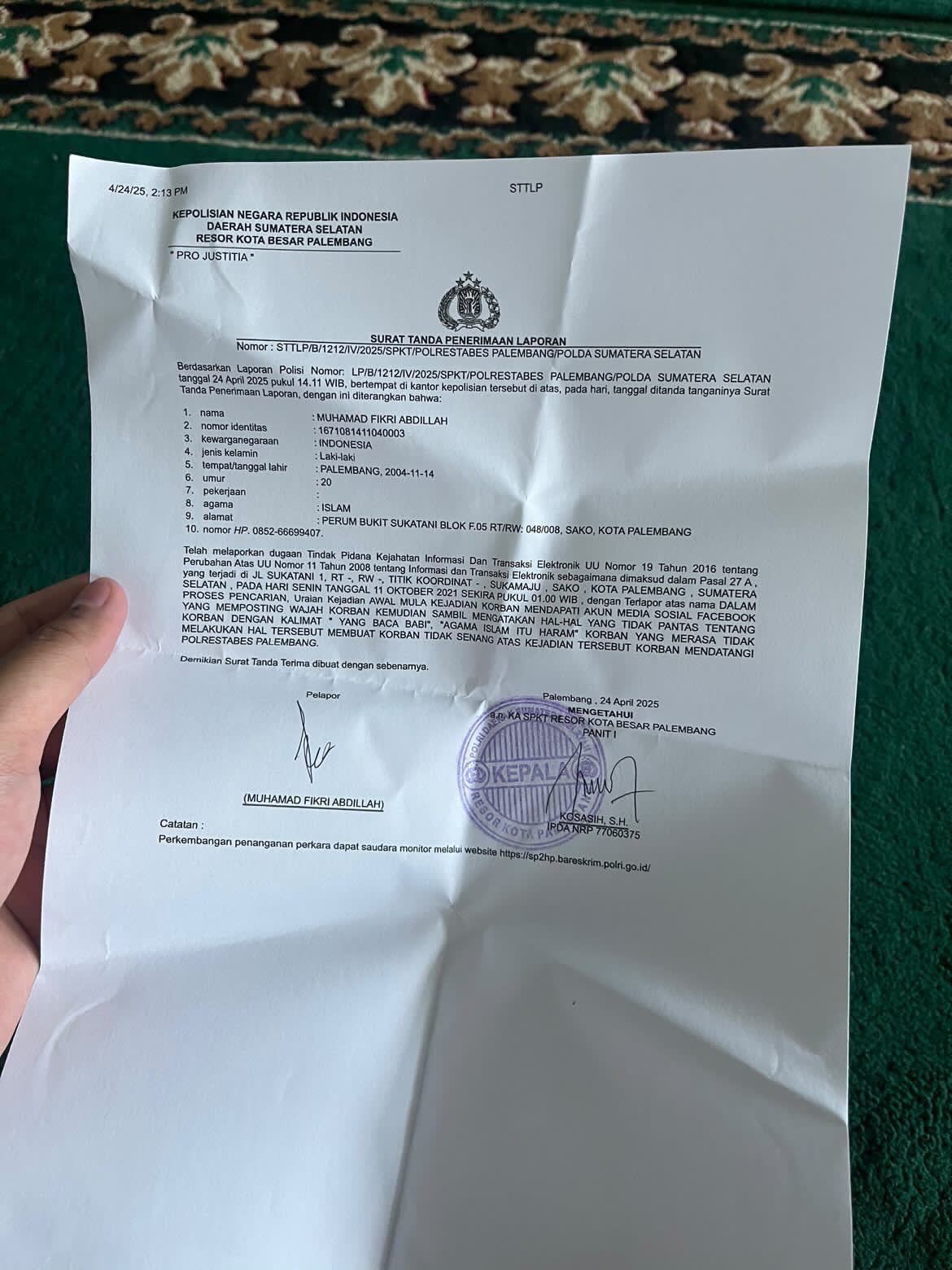 Palembang,fokuskriminal .com-17 Juni 2025 – Muhammad Fikri Abdillah resmi melaporkan dugaan kasus pencemaran nama baik yang dialaminya ke Polrestabes Palembang, pada Senin (16/06).