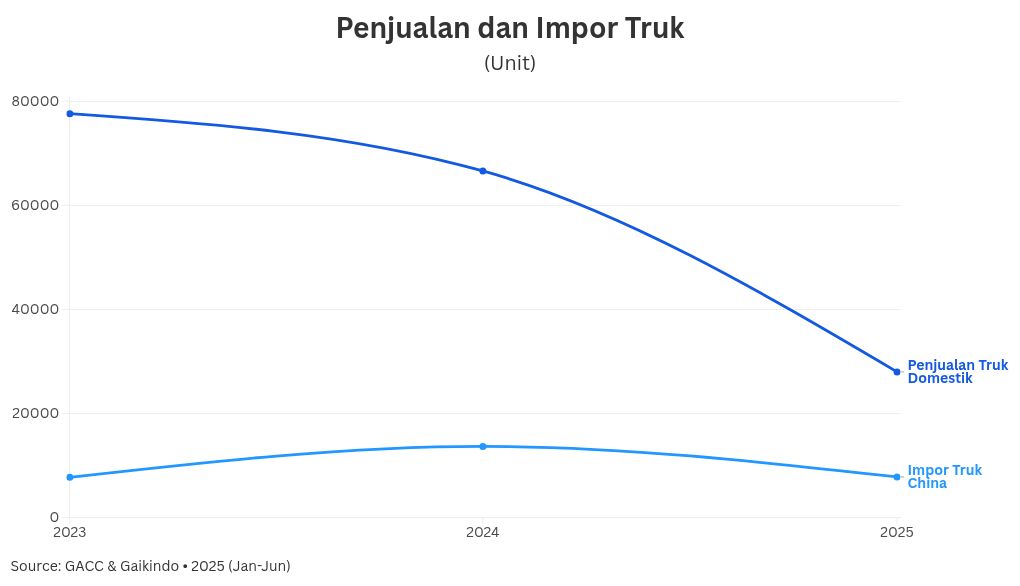 Sekretaris Umum Gaikindo Kukuh Kumara mengakui produk truk Tiongkok yang membanjiri pasar dalam negeri. “Pasar truk lokal semakin tergerus, terutama dengan kondisi pasar yang stagnan saat ini,” katanya kepada Bisnis, Rabu (6/8/2025).